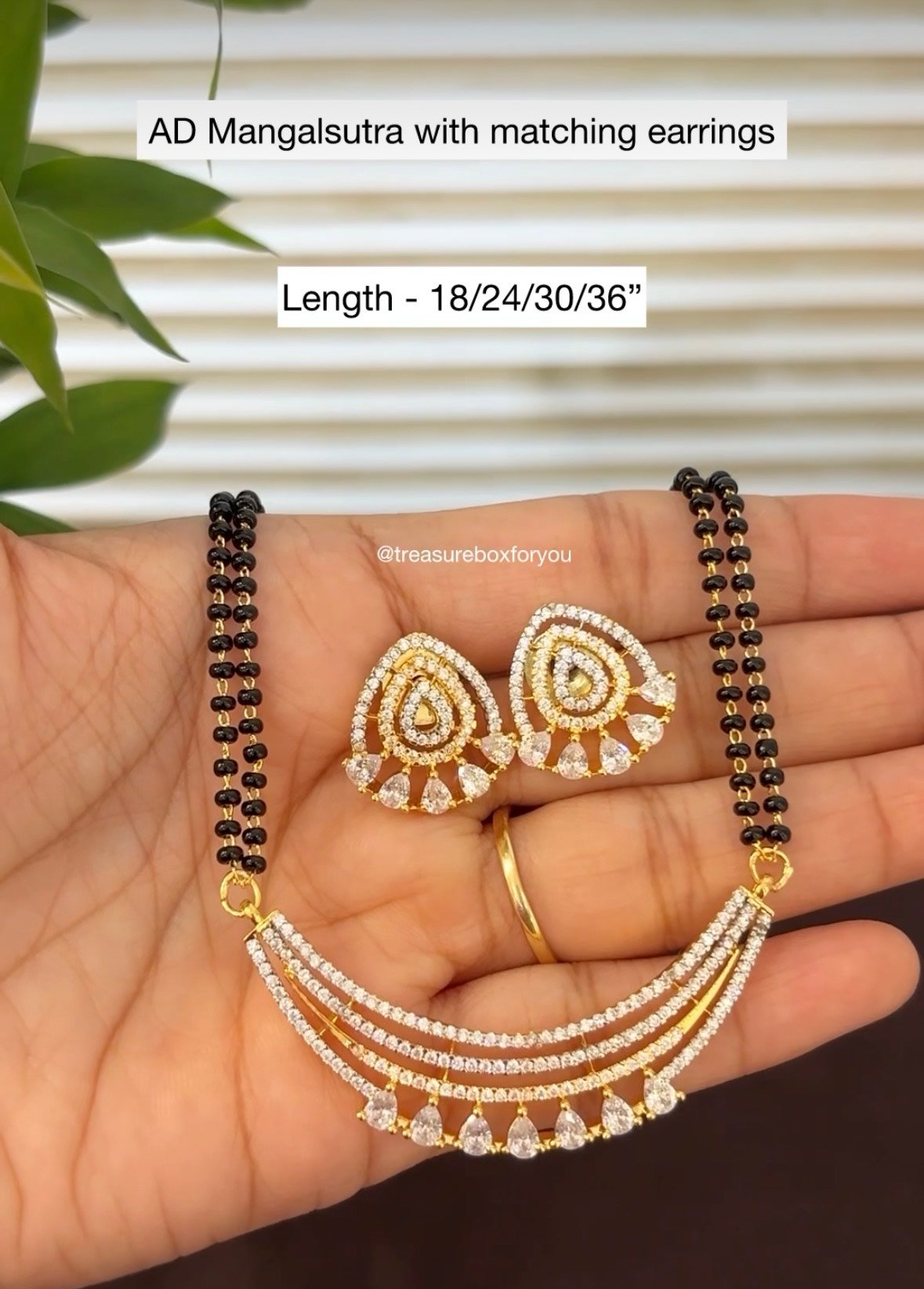 A beautifully crafted mangalsutra set featuring sparkling American diamonds for a refined and timeless look. Designed to balance tradition with modern elegance, this set is perfect for Festive wear as well as special occasions.