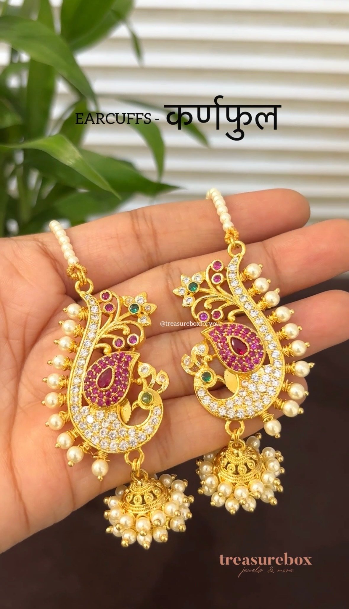 Elegant gold plated earcuffs featuring a classic peacock motif. These earcuffs add a traditional touch to any ethnic or fusion outfit. Lightweight and easy to style for festive, wedding, or special occasions.