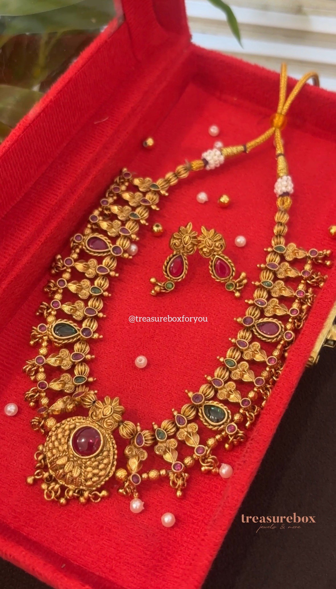 Celebrate the grandeur of Maharashtrian heritage with this exquisite Rajwadi Gold Plated Kolhapuri Saaj. Inspired by traditional royal jewellery, this timeless necklace features intricately crafted motifs that reflect the elegance and cultural richness of Kolhapur craftsmanship.