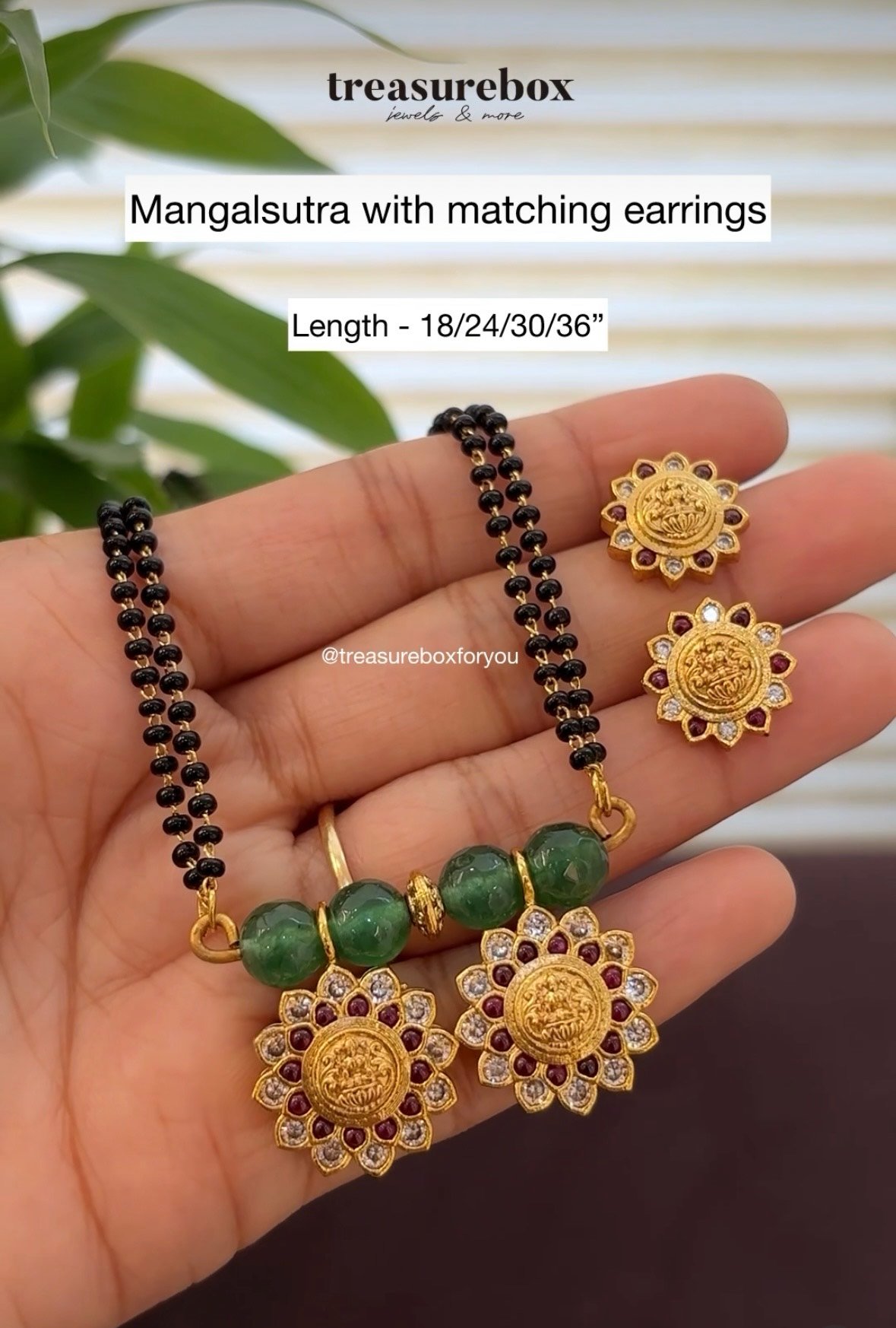 Antique gold plated designer mangalsutra set with matching earrings, featuring elegant detailing and a classic finish. Lightweight and comfortable, perfect for wedding ceremonies & festive occasions.
